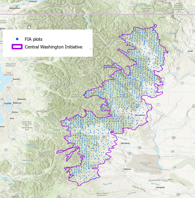 This landscape contains approximately 2.3 million acres of forest land within the counties of Celan, Kittitas, Okanagan and Yakima in central Washington, just east of the Cascade crest, and a mix of land ownerships, with national forest accounting for 75 percent of the forest area, with 13 percent in state ownership and most of the rest privately owned. Dry and mesic mixed conifer forests are found there, as well as pure ponderosa pine, and opportunities abound to promote greater fire resistance in all of them to varying degrees. The Forest Service selected this landscape as one of the first ten nationwide to prioritize for implementing its Wildfire Crisis Strategy owing to its importance for reducing fire risk to communities in many parts of this landscape. As a demonstration project, this project includes all FIA plot data within the landscape boundary and provides an opportunity to experiment with a real landscape where fuels treatments are not only contemplated but actively underway. The area actually treated in this landscape will likely be far less than the entire landscape, by design, though that is not reflected in this demonstration project which is intended to orient users to the BioSum workflow. Geographic selection of plots to include in analysis is outside the scope of this version of the project and is a known limitation that will be addressed in future versions.